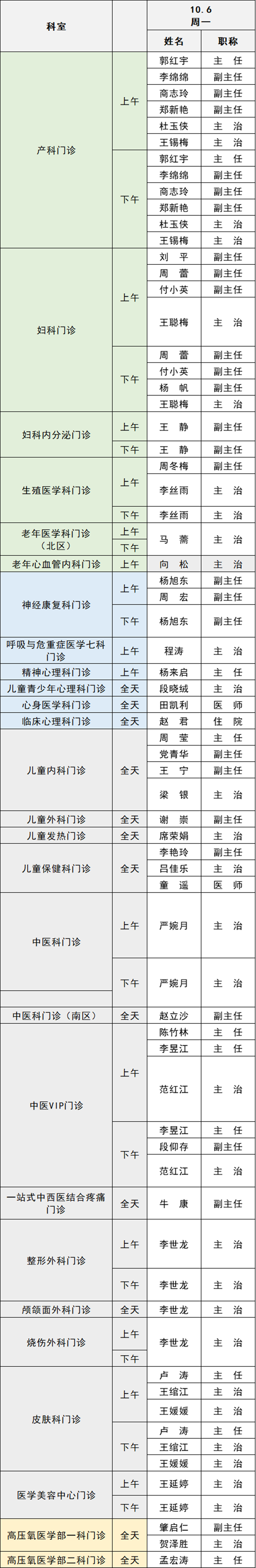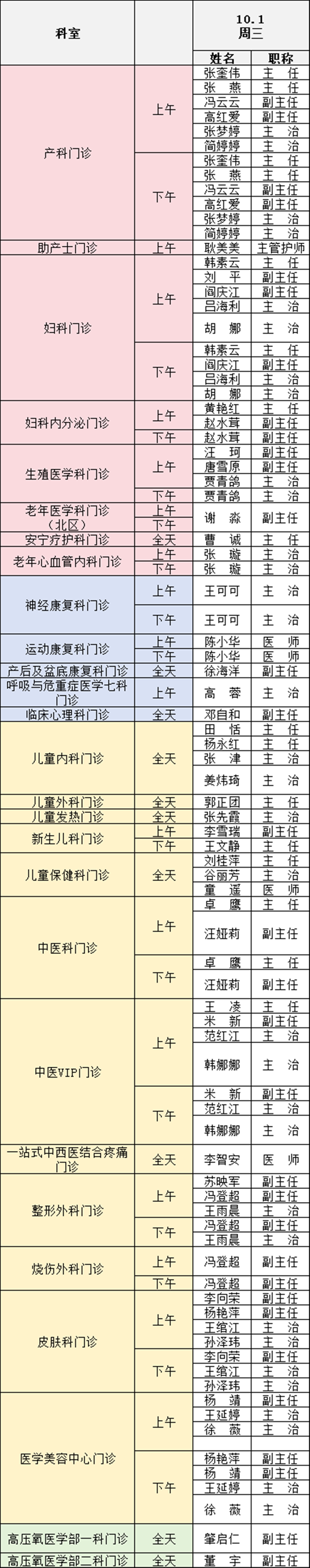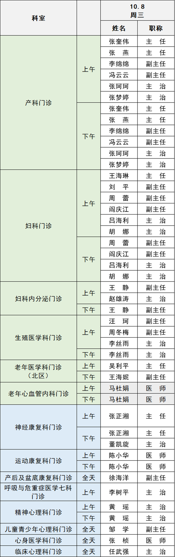 備注:實際出診情況以醫(yī)院掛號平臺實時信息為準。“職稱”欄里主任=主任醫(yī)師副主任=副主任醫(yī)師主治=主治醫(yī)師